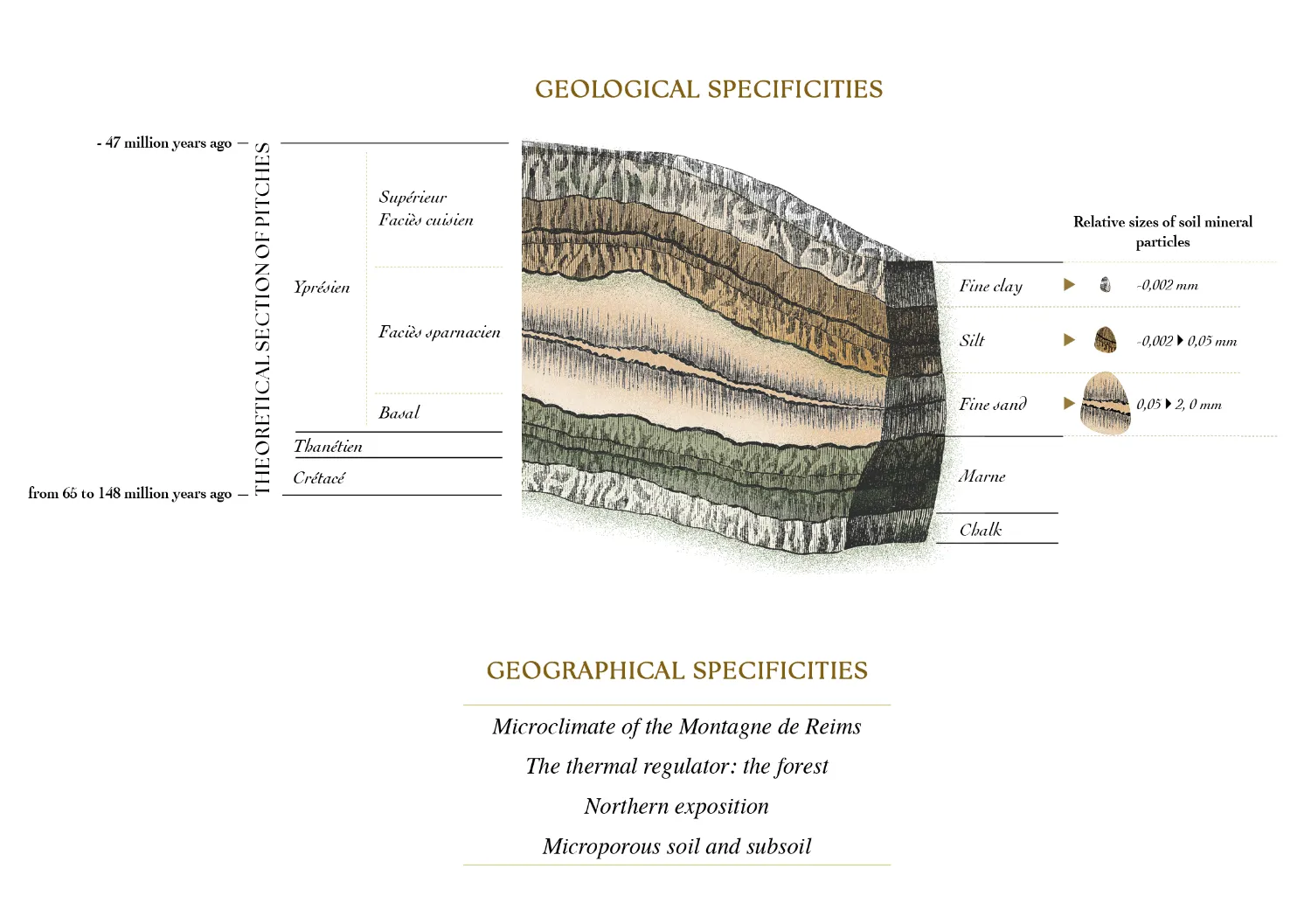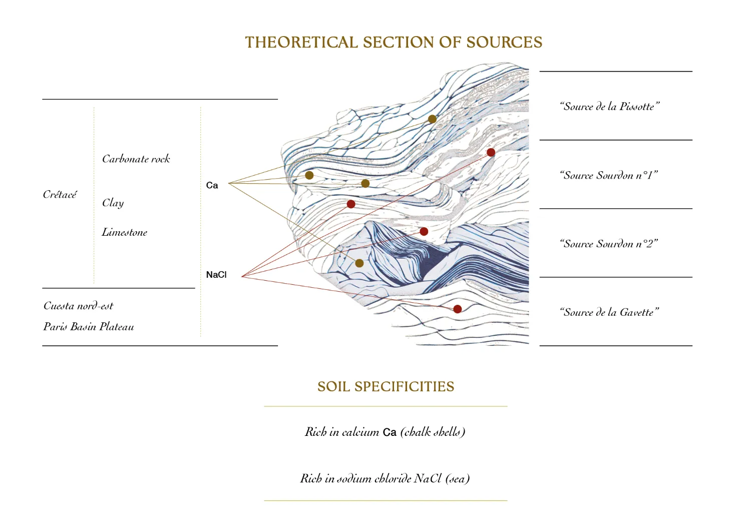 Five layers are superimposed: chalk, marl, sand, silt, and fine clay. The soil is particularly well-drained. The subsoil is irrigated by natural springs extremely rich in calcium chloride NaCl and minerals.