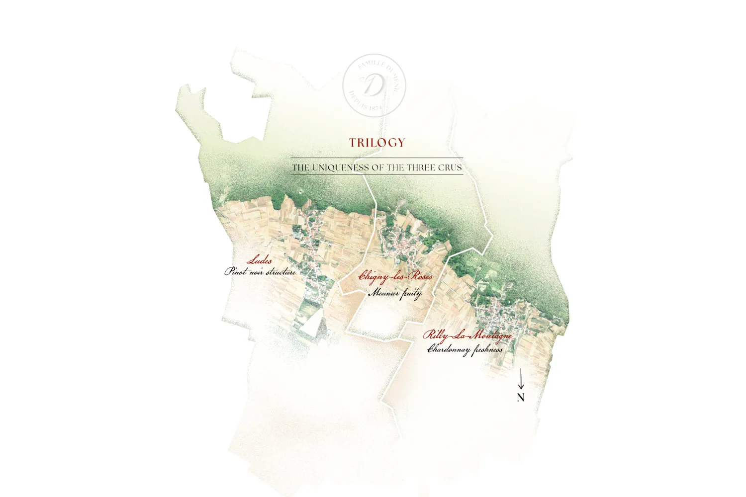 Our 8 hectares of vineyards are located exclusively in Terroir classified as 1er Cru. Chigny-les-Roses, Rilly-la Montagne, and Ludes are backed by the Montagne de Reims, a natural barrier that regulates temperature. Our terroir is unique due to its soil and subsoil, its exposure, and its natural springs. The vineyards are planted with the classic grape varieties: Pinot Noir, Pinot Meunier, and Chardonnay.