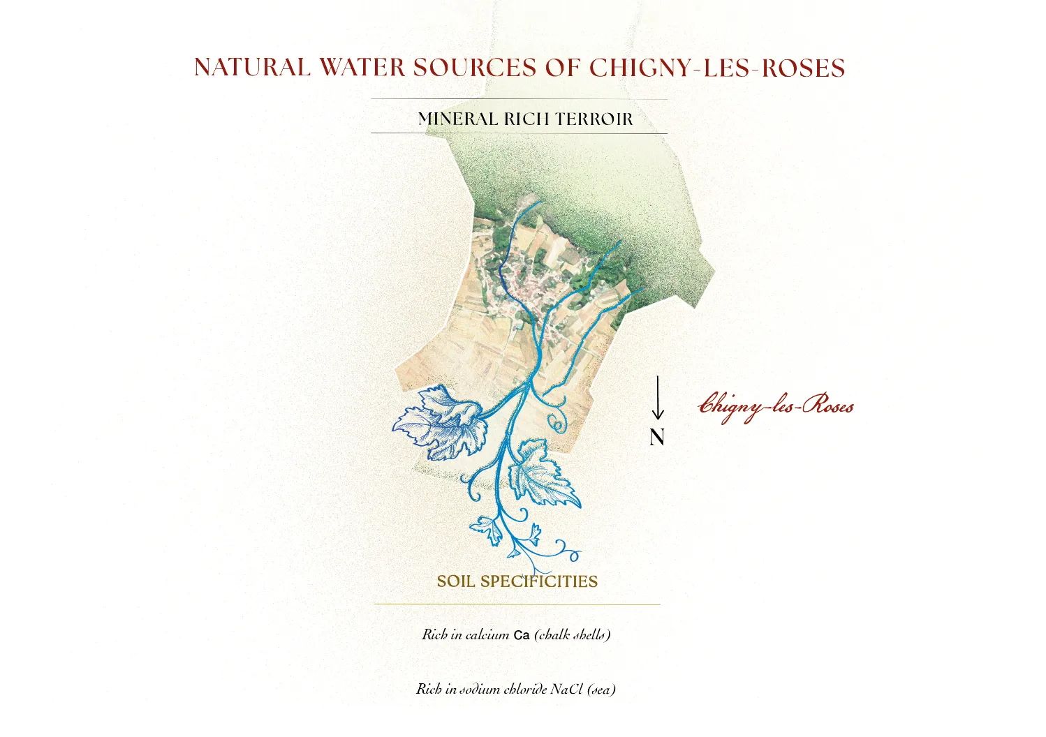 The village of Chigny les Roses is fed by natural springs rich in minerals, making this terroir so special. The water is exceptionally pure and has been flowing continuously since 1820. The vineyard is supported by five geological layers: chalk, marl, sand, silt, fine clay. The chalk emerges depending on the slopes. The water is particularly rich in natural minerals.